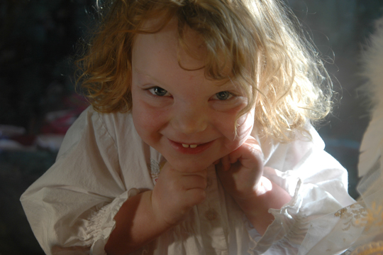 It was kind of nice because the white halo made her look like an angel in the light, but I really wanted to turn the brightness down for just that part of the picture. So I experimented with the Photoshop burn tool, and this was the result: