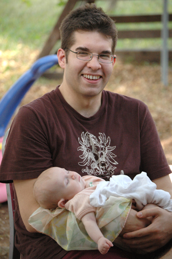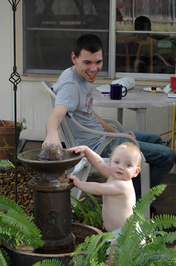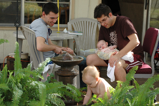 Sean holding the top part of the fountain so Damian can’t knock it over.