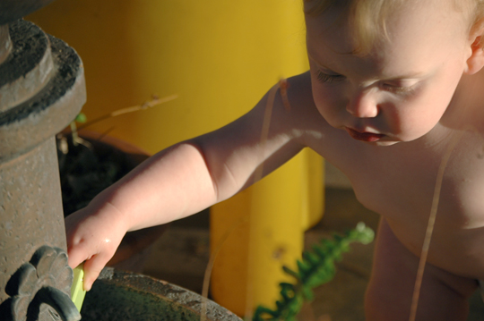 Damian playing with the water fountain.