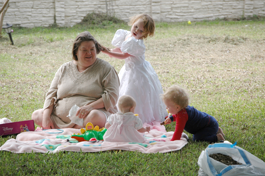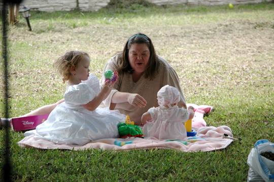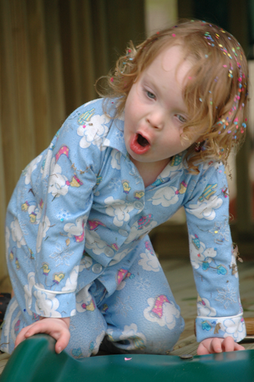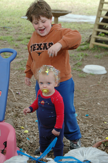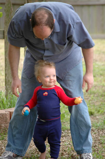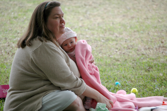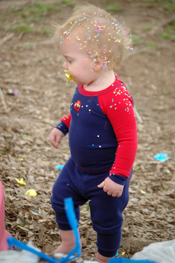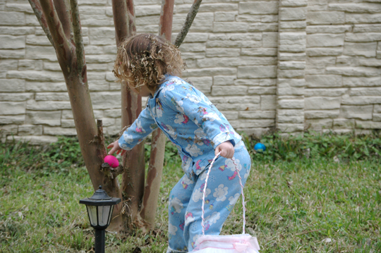 Lily hunting Easter eggs. (Do you see all the leaves in her hair?