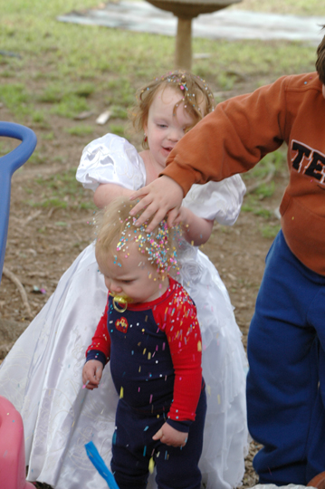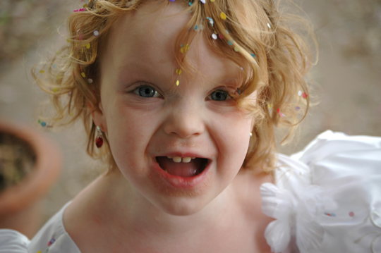 paper confetti and old dry leaves. After pouring confetti in her hair,