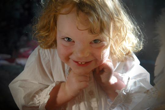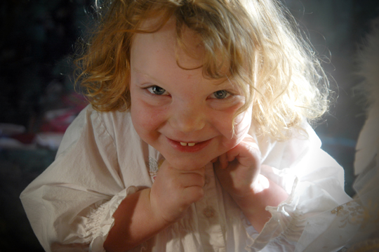 It was kind of nice because the white halo made her look like an angel in the light, but I really wanted to turn the brightness down for just that part of the picture. So I experimented with the Photoshop burn tool, and this was the result:
