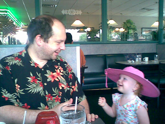 Daddy and Lily playing with her hat at Denny’s this morning.